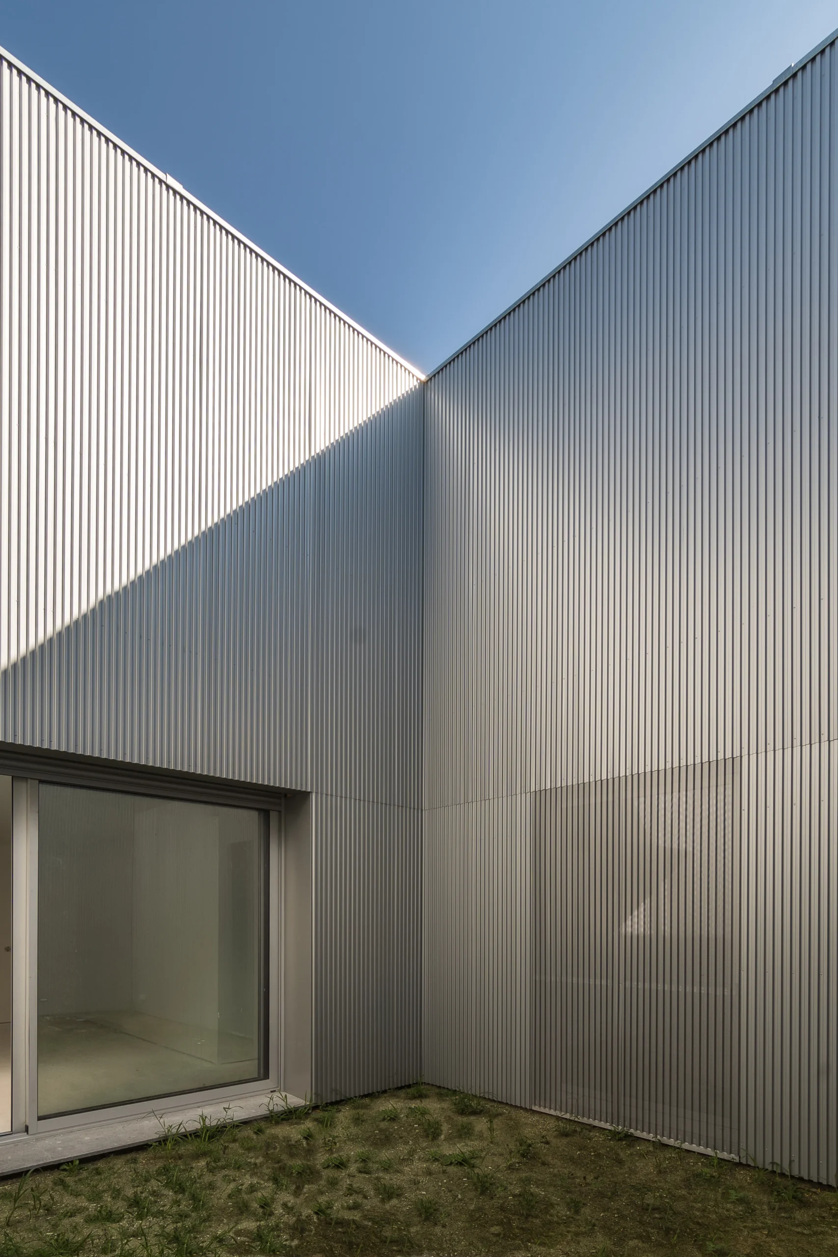 Desde a rua, o conjunto revela-se discreto e elegante — as garagens duplas desenham uma fachada minimalista, dando a perceção de um único piso e reforçando a harmonia do projeto com a paisagem.